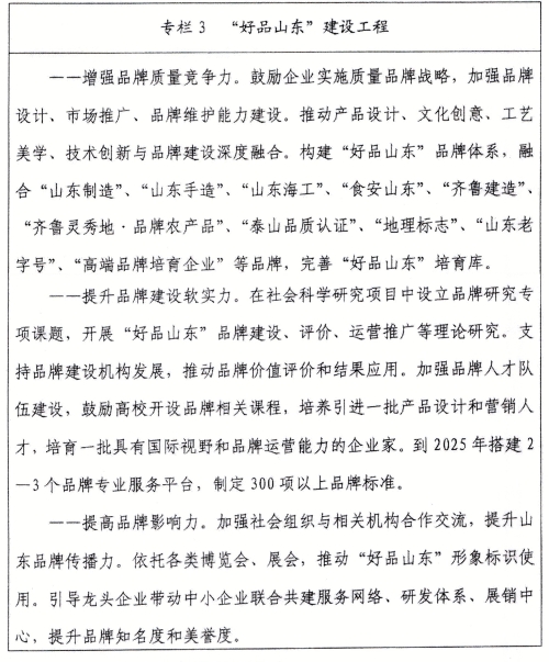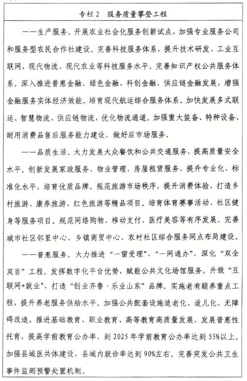 培育复合型手艺工人。推进数字经济、医养健康、精品旅逛等现代办事业集群扶植。——企业质量成长能力显著提高。推进现代农业全财产链尺度化试点。鞭策山东半岛城市群和济南、青岛都会圈立异质量办理。